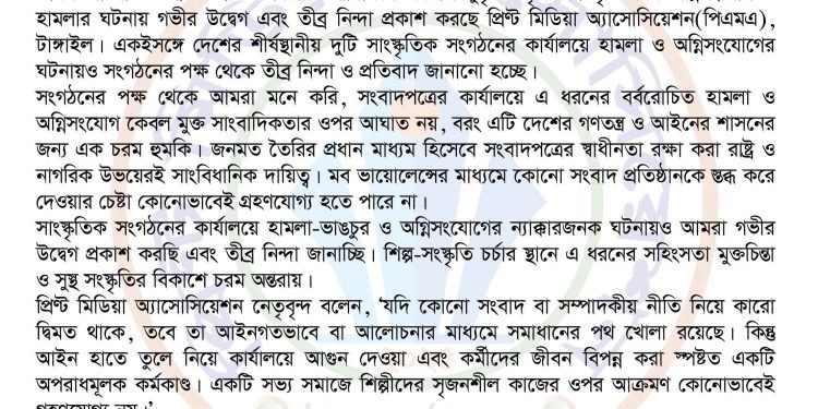 সাংস্কৃতিক সংগঠনের কার্যালয়ে হামলা-ভাঙচুর ও অগ্নিসংযোগের ন্যাক্কারজনক ঘটনায়ও আমরা গভীর উদ্বেগ প্রকাশ করছি এবং তীব্র নিন্দা জানাচ্ছি। শিল্প-সংস্কৃতি চর্চার স্থানে এ ধরনের সহিংসতা মুক্তচিন্তা ও সুস্থ সংস্কৃতির বিকাশে চরম অন্তরায়।