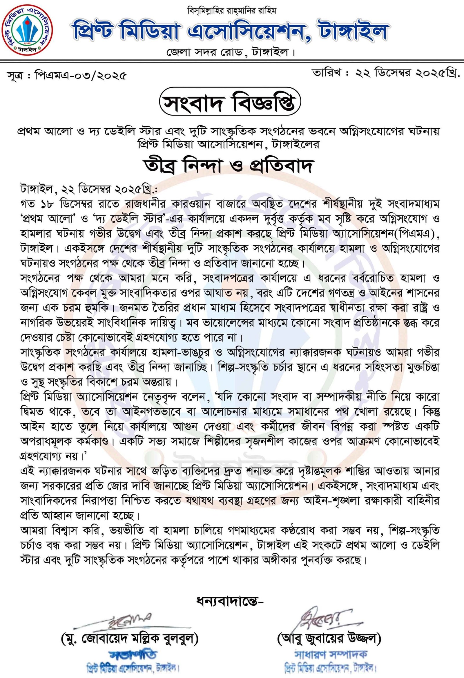 আমরা বিশ্বাস করি, ভয়ভীতি বা হামলা চালিয়ে গণমাধ্যমের কণ্ঠরোধ করা সম্ভব নয়, শিল্প-সংস্কৃতি চর্চাও বন্ধ করা সম্ভব নয়। প্রিণ্ট মিডিয়া অ্যাসোসিয়েশন, টাঙ্গাইল এই সংকটে প্রথম আলো ও ডেইলি স্টার এবং দুটি সাংস্কৃতিক সংগঠনের কর্তৃপক্ষের পাশে থাকার অঙ্গীকার ব্যক্ত করেন। উল্লেখ্য, গত ১৮ ডিসেম্বর রাতে রাজধানীর কারওয়ান বাজারে অবস্থিত দেশের শীর্ষস্থানীয় দুই সংবাদমাধ্যম আর দেশের শীর্ষস্থানীয় দুটি সাংস্কৃতিক সংগঠনের কার্যালয়ে হামলা ও অগ্নিসংযোগের ঘটনাটি ঘটে।